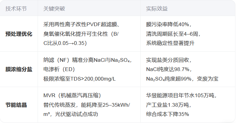 典型案例:国能包头煤化工项目采用“纳滤分盐 + 冷冻析硝 + MVR蒸发”全流程,实现废水全回用,副产盐作为化工原料外售,年创收超6000万元,真正实现“废水变资源”。